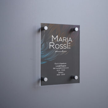 La TARGA PERSONALIZZATA THIN LINE PLEXPLATE con la sua forma allungata offre un design semplice ed elegante ideale per la realizzazione di targhe nominative all'ingresso degli uffici.